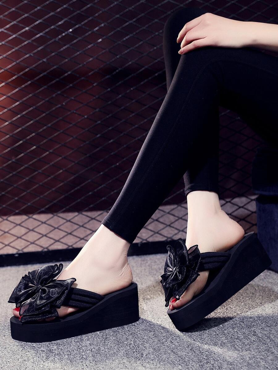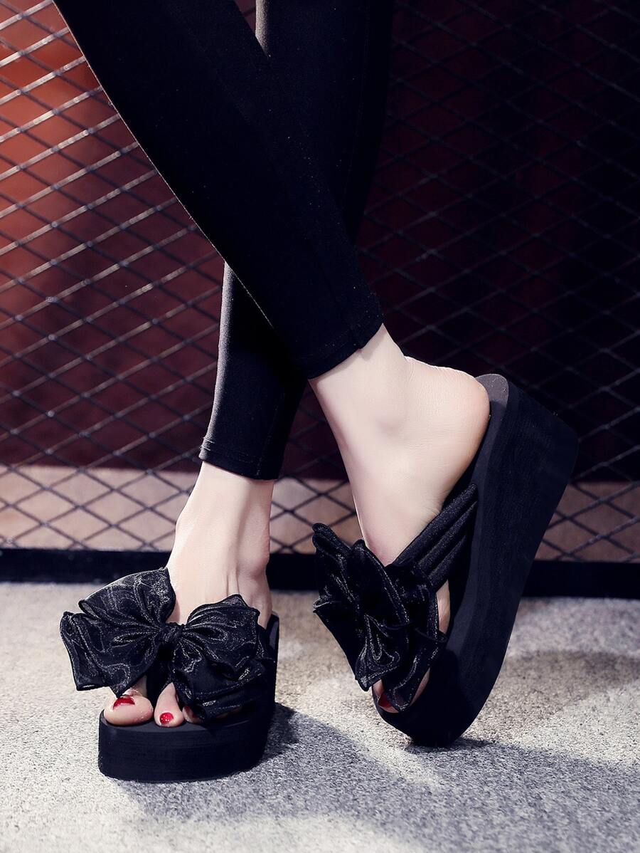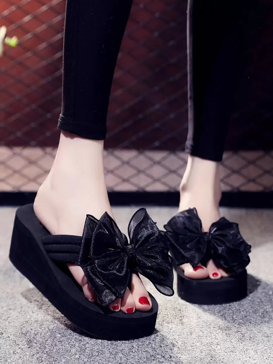 1 Pair Women's Bow Decor Thick Sole Slide Sandals, High Heel Fashion Flip Flops For Summer