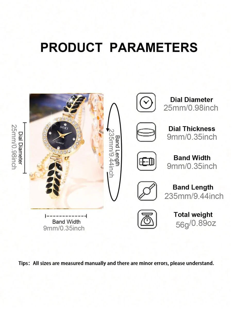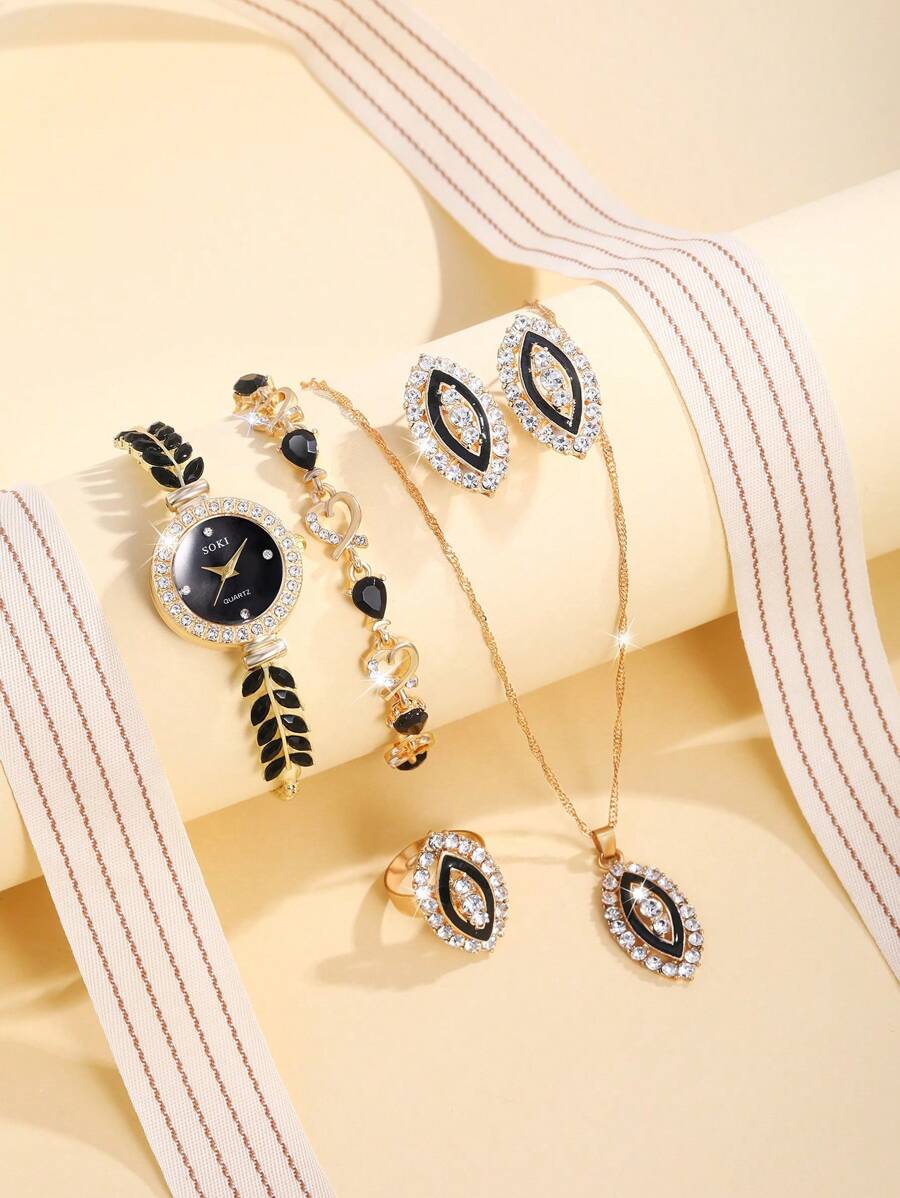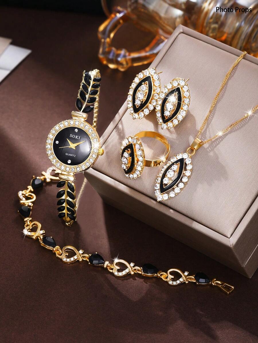 6pcs/Set Ladies Watch Women's Green Feather Fish Tail Style Strap Casual Quartz Watch With Gorgeous Full Rhinestone Dial And Heart Necklace Earings Rings Bracelet Shaped Full Rhinestone Love Jewelry Set Suitable For Daily Wear, Back-To-School Season, Grad