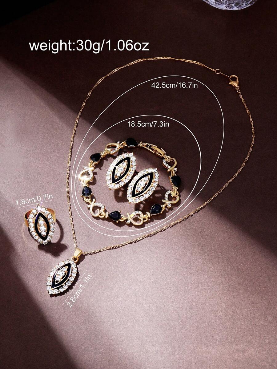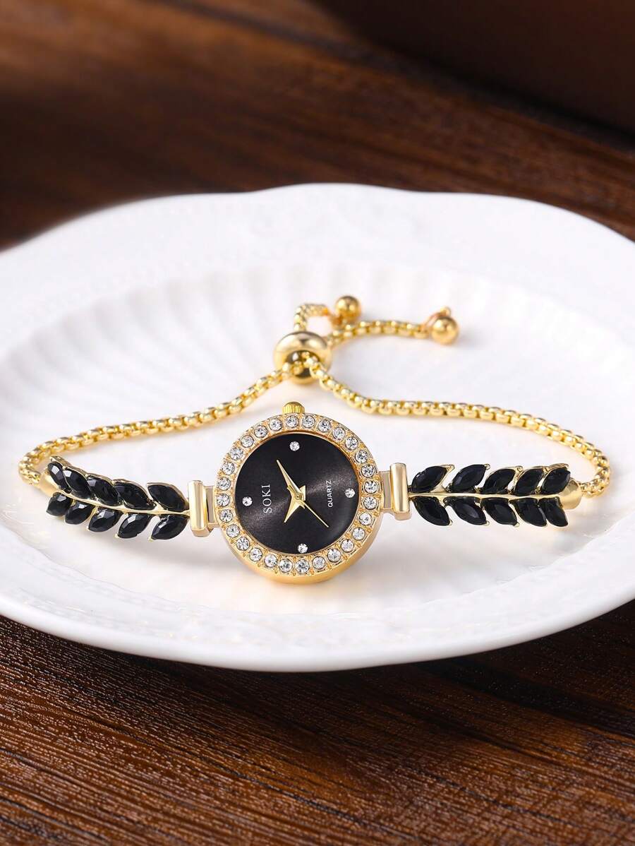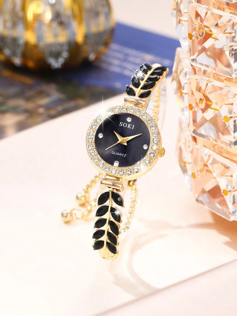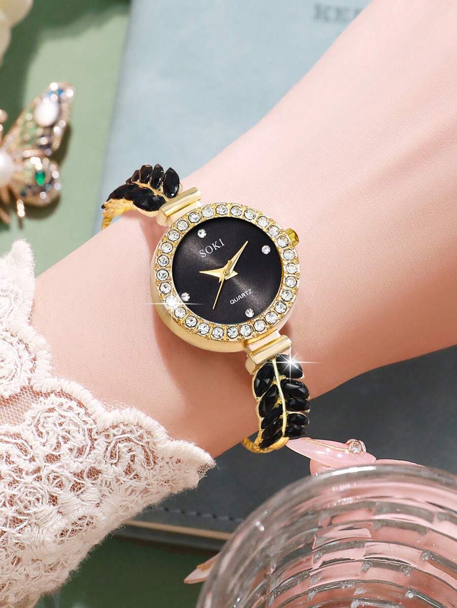 6pcs/Set Ladies Watch Women's Green Feather Fish Tail Style Strap Casual Quartz Watch With Gorgeous Full Rhinestone Dial And Heart Necklace Earings Rings Bracelet Shaped Full Rhinestone Love Jewelry Set Suitable For Daily Wear, Back-To-School Season, Grad