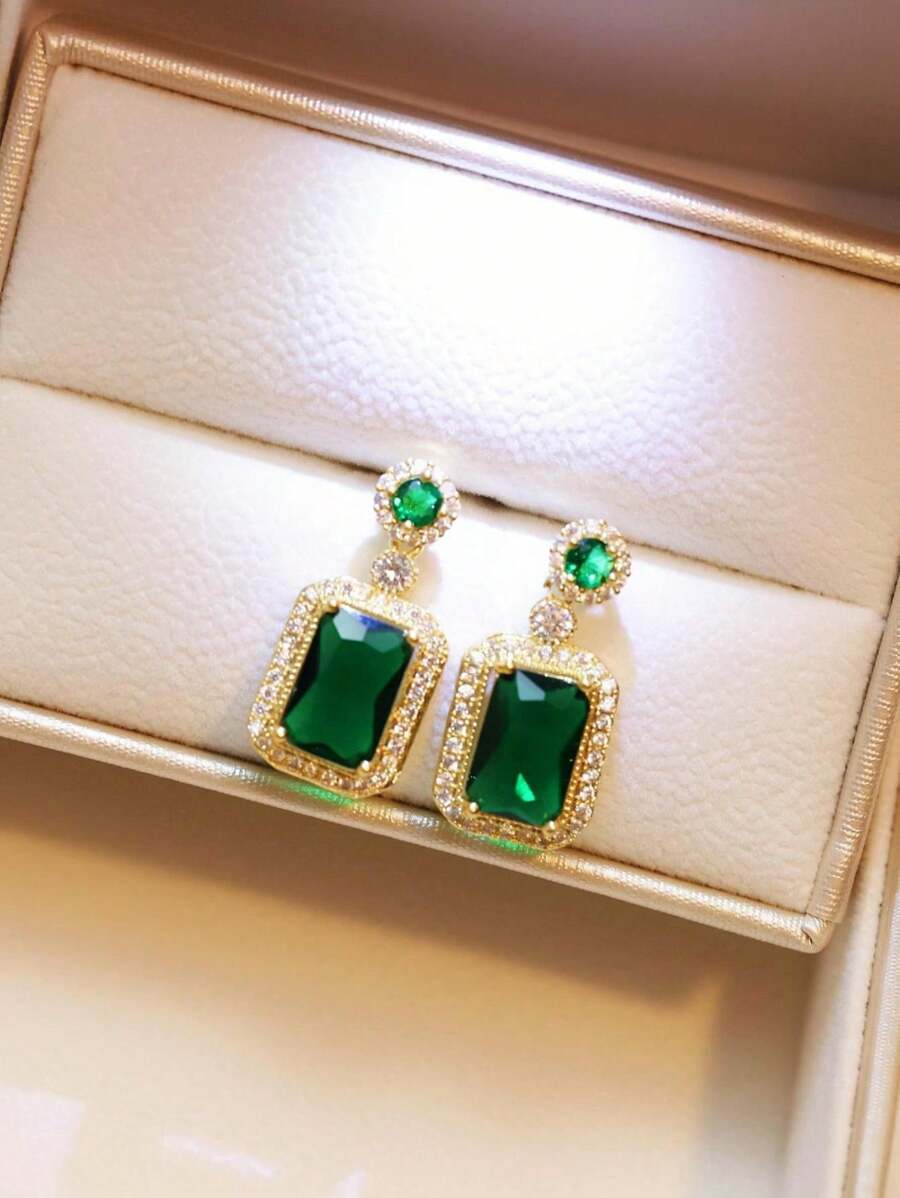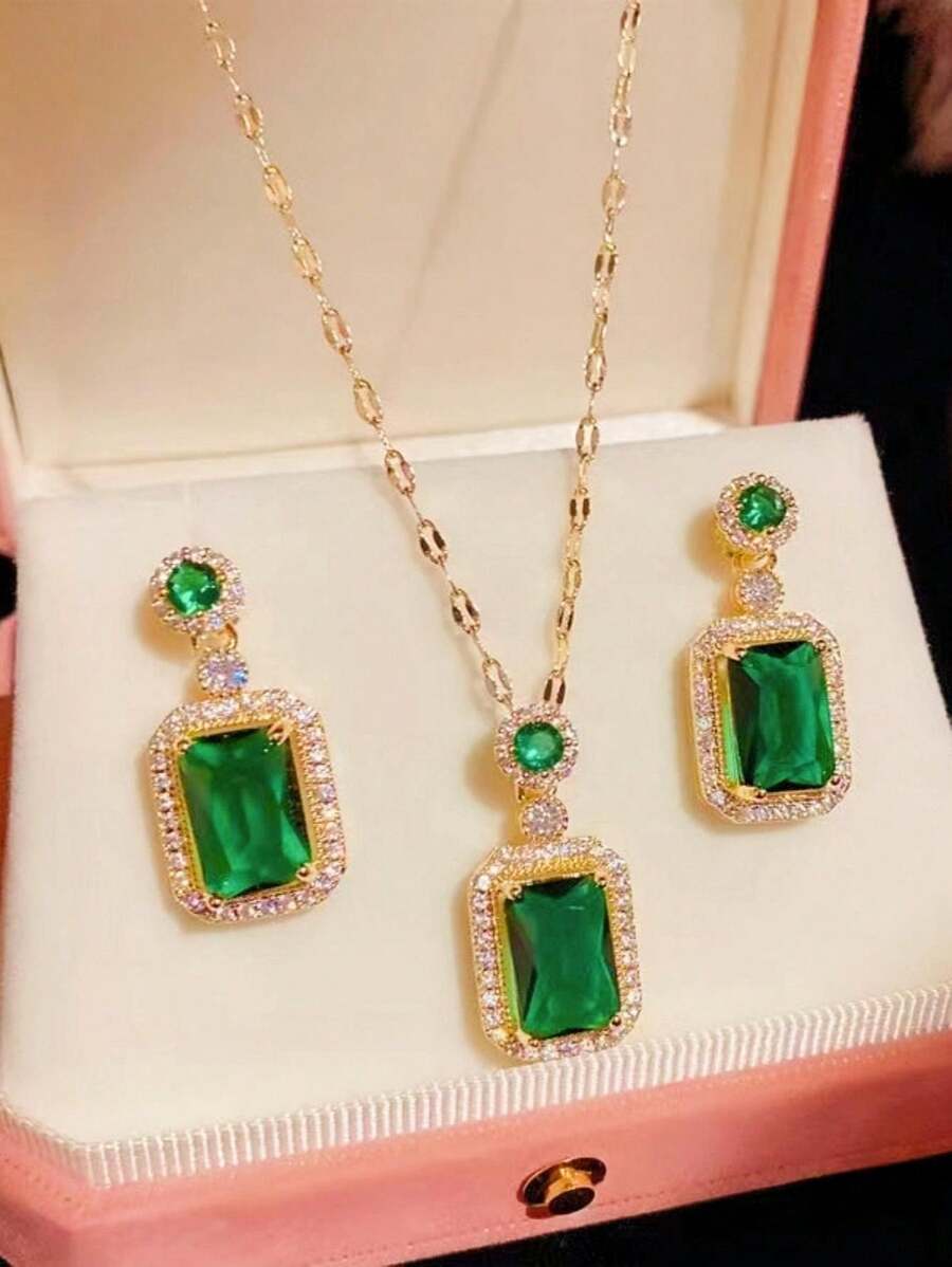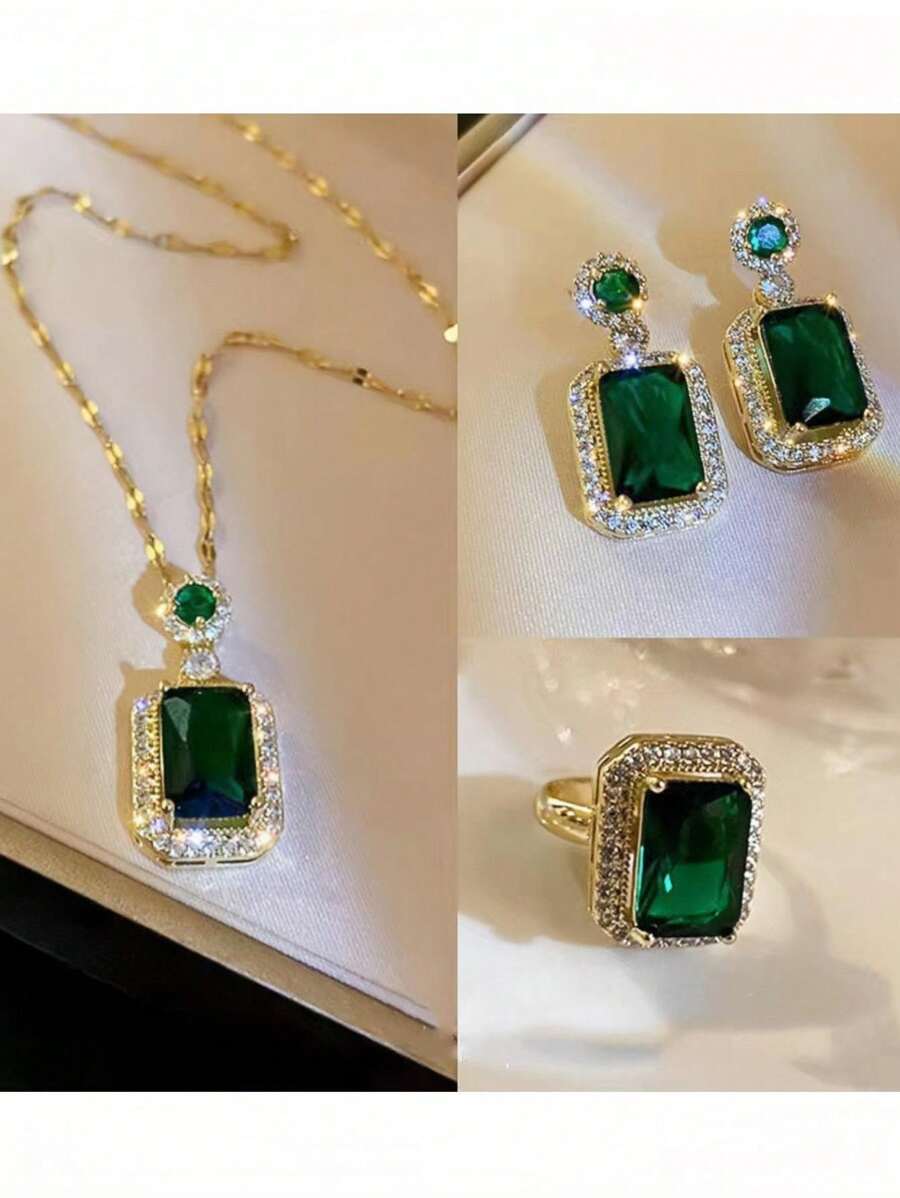 Green Diamond High-End Earrings, Necklace, Ring Set, Banquet Dress Accessories