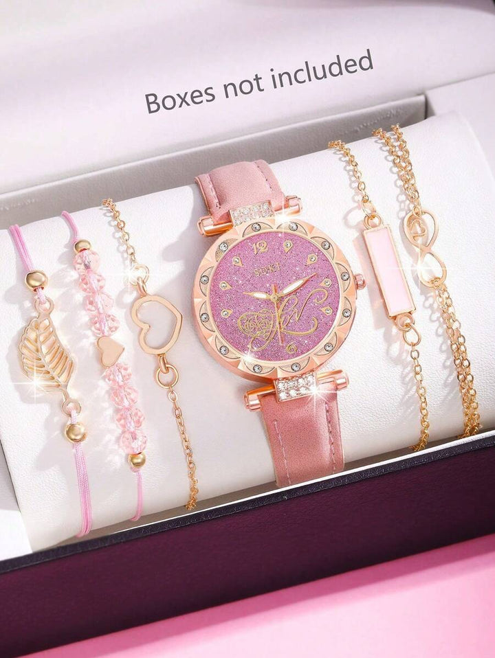 SOKI 6pcs Women's Watch Fashion Casual Heart-Shaped Digital Circular Dial Quartz Watch And Bracelet Suitable For Women's Parties, Festivals, Birthdays Or Sisterhood Gifts, Is The Best Gift For Women (No Box)