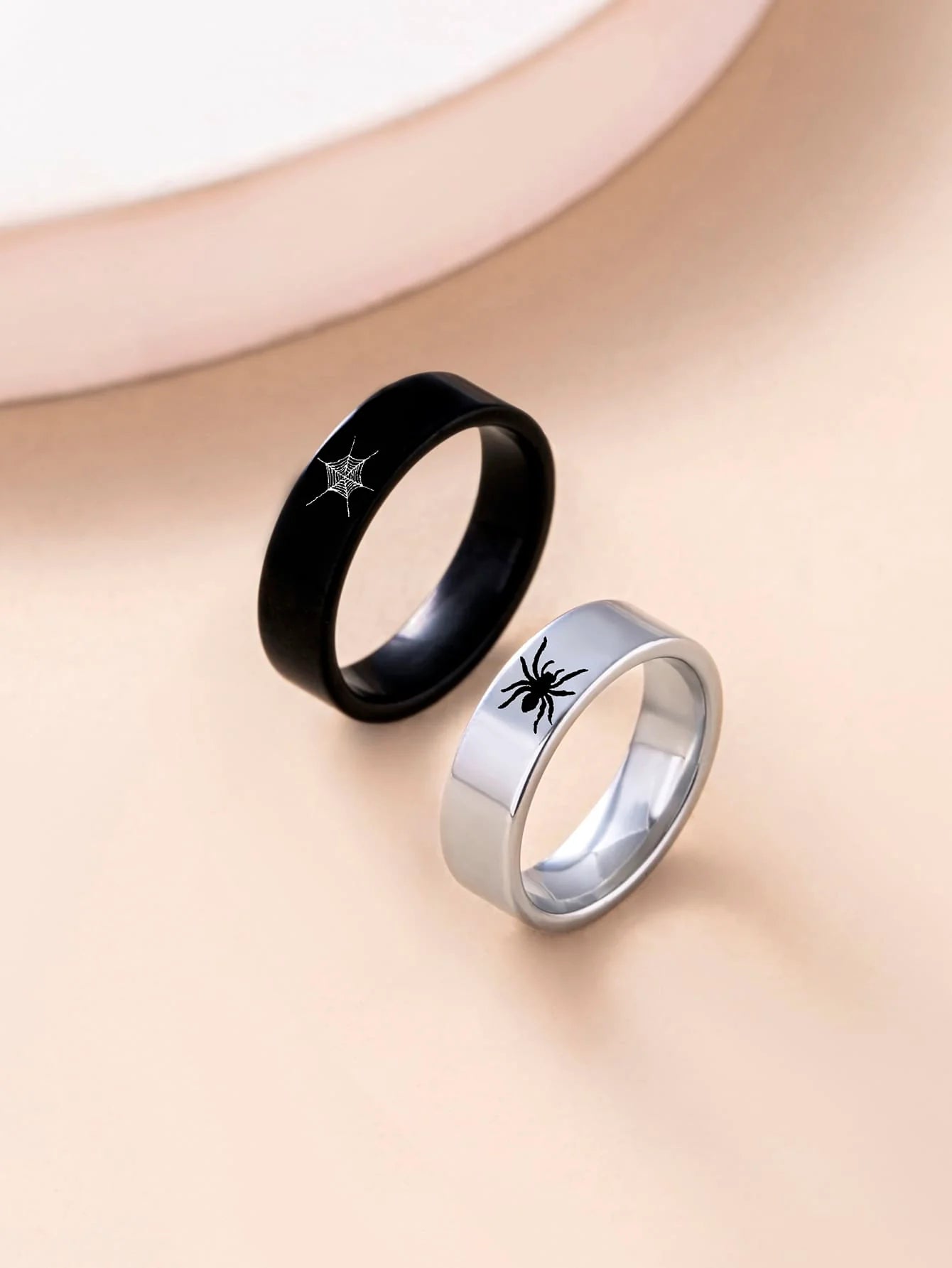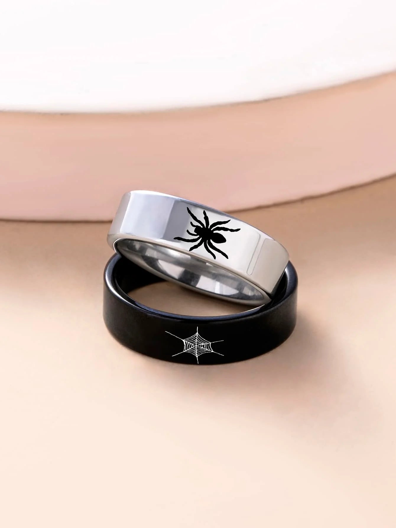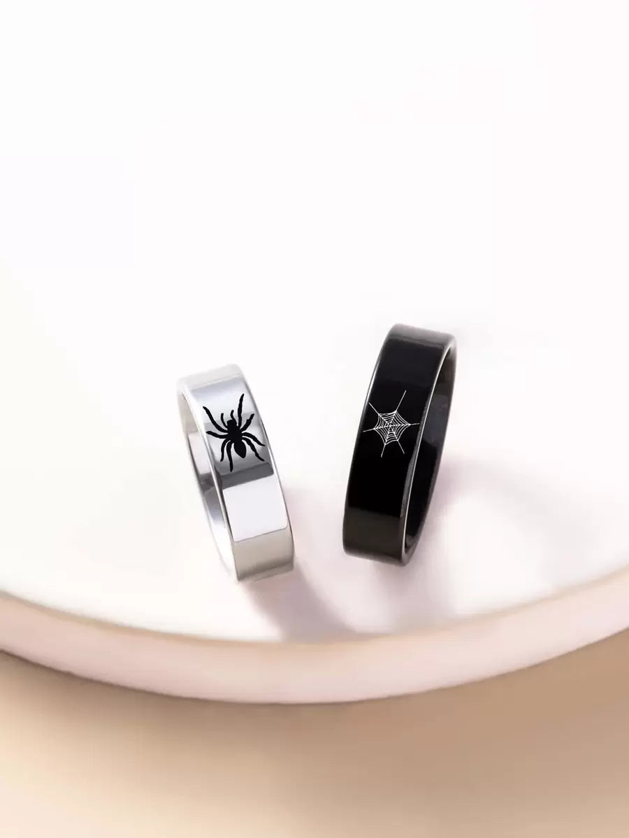 suteyi 2pcs Stainless Steel Spider Print Couple Rings, Halloween Spider Dark Rings